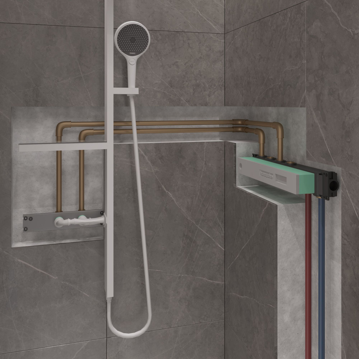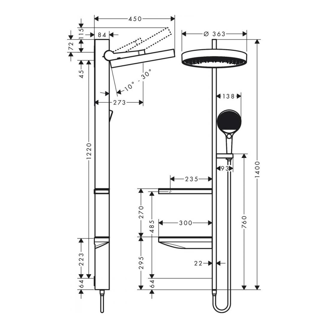 Верхний душ, ручной душ, шланг для душа, держатель для душа, полочки, душевая штанга